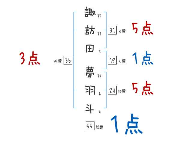外運![]() | 諏訪田夢羽斗さんの外運は36画の3つ星!先見性が豊かです。多少神経質で苦労することも。 生活面を象徴する運勢です。外部から受ける影響力を表し、結婚運、家庭運や職場、環境への順応性を表します。 |