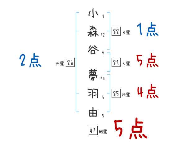 総運![]() | 小森谷夢羽由さんの総運は47画の5つ星!実力が開花し発展する円満な人生。財に恵まれる。 あなたの人生を表す1番重要な運勢です。生涯を通じて影響する総合運となり、主に50歳以降の晩年期に影響を及ぼします。 |