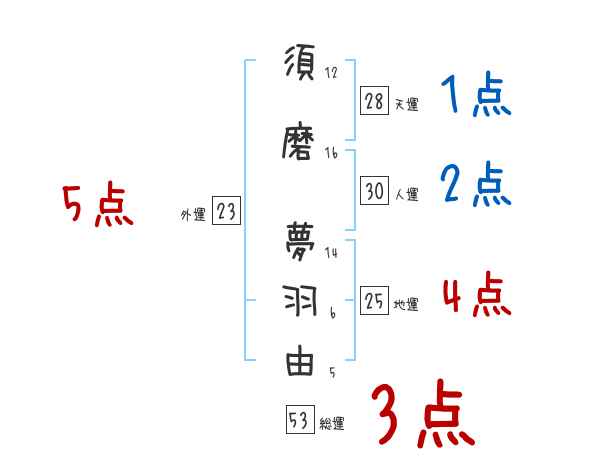 天運![]() | 須磨夢羽由さんの天運は28画の1つ星!家庭環境に注意。スポーツで活躍できる能力があるかも。 家系が持つ宿命的な運勢を表します。祖先から受け継いだ苗字ですので自分の力が及びません。家柄を象徴します。 |