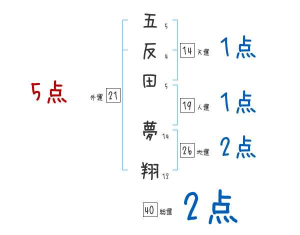 天運![]() | 五反田夢翔さんの天運は14画の1つ星!人に対して優しいがストレスを溜め込みがち。人間関係のトラブルを避けるよう気をつけましょう。 家系が持つ宿命的な運勢を表します。祖先から受け継いだ苗字ですので自分の力が及びません。家柄を象徴します。 |