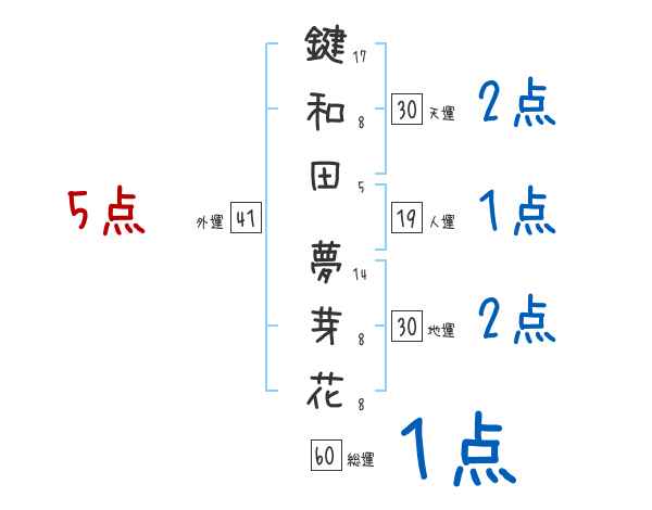 天運![]() | 鍵和田夢芽花さんの天運は30画の2つ星!浮き沈みの激しさに注意しましょう。 家系が持つ宿命的な運勢を表します。祖先から受け継いだ苗字ですので自分の力が及びません。家柄を象徴します。 |