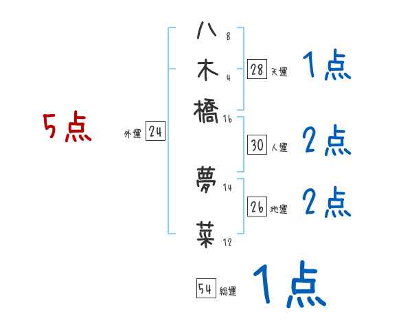 天運![]() | 八木橋夢菜さんの天運は28画の1つ星!家庭環境に注意。スポーツで活躍できる能力があるかも。 家系が持つ宿命的な運勢を表します。祖先から受け継いだ苗字ですので自分の力が及びません。家柄を象徴します。 |