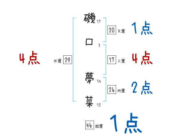 総運![]() | 磯口夢菜さんの総運は46画の1つ星!迷走することが多く苦労するかも。目先のことにとらわれないように。 あなたの人生を表す1番重要な運勢です。生涯を通じて影響する総合運となり、主に50歳以降の晩年期に影響を及ぼします。 |