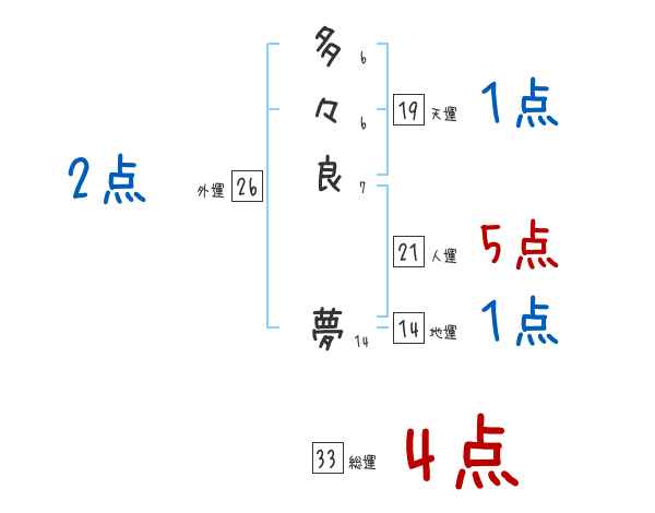 天運![]() | 多々良夢さんの天運は19画の1つ星!優れた才能を持ちますが、協調性が足りないことも。周りの人と協力する事を意識しましょう。 家系が持つ宿命的な運勢を表します。祖先から受け継いだ苗字ですので自分の力が及びません。家柄を象徴します。 |