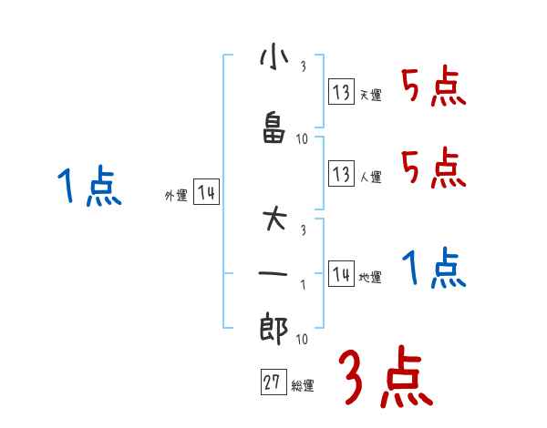 人運![]() | 小畠大一郎さんの人運は13画の5つ星!才能に恵まれ人気がある。名声を手に入れる。円満な人生。 性格や才能などを表す2番目に重要な運勢です。人間関係や協調性、社会的な成功に影響します。主に20歳から50歳ぐらいまでの中年期の運勢を表します。 |
