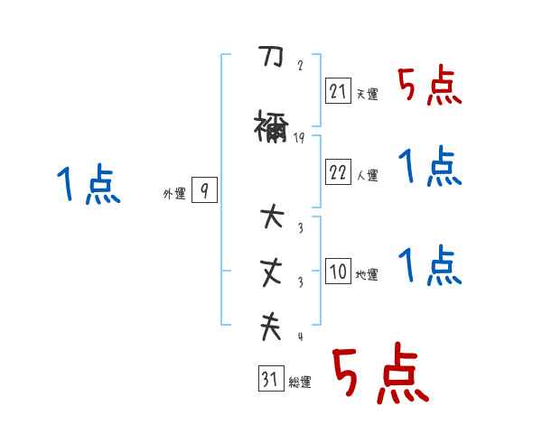 天運![]() | 刀禰大丈夫さんの天運は21画の5つ星!統率力がある。独立し成功する。名誉を手に入れる。 家系が持つ宿命的な運勢を表します。祖先から受け継いだ苗字ですので自分の力が及びません。家柄を象徴します。 |