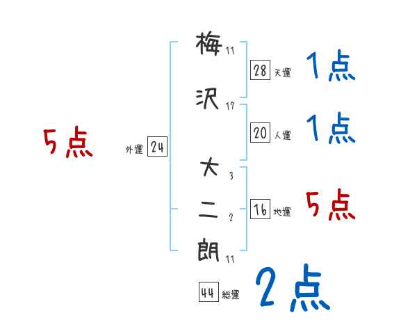 天運![]() | 梅沢大二朗さんの天運は28画の1つ星!家庭環境に注意。スポーツで活躍できる能力があるかも。 家系が持つ宿命的な運勢を表します。祖先から受け継いだ苗字ですので自分の力が及びません。家柄を象徴します。 |
