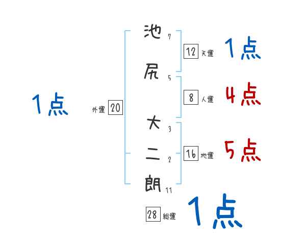 | 総運  | 池尻大二朗さんの総運は28画の1つ星!家庭環境に注意。スポーツで活躍できる能力があるかも。あなたの人生を表す1番重要な運勢です。生涯を通じて影響する総合運となり、主に50歳以降の晩年期に影響を及ぼします。 |