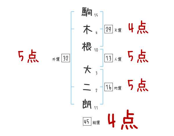 外運![]() | 駒木根大二朗さんの外運は32画の5つ星!柔軟性があり成功する。チャンスが多く金運が良い。 生活面を象徴する運勢です。外部から受ける影響力を表し、結婚運、家庭運や職場、環境への順応性を表します。 |