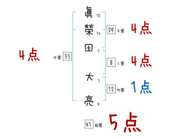 天運![]() | 眞榮田大亮さんの天運は29画の4つ星!完全主義で才能がある。厳格な心の持ち主。 家系が持つ宿命的な運勢を表します。祖先から受け継いだ苗字ですので自分の力が及びません。家柄を象徴します。 |