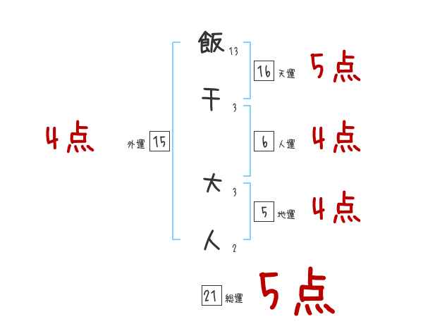 天運![]() | 飯干大人さんの天運は16画の5つ星!人望が厚く大きく発展する。逆転成功が見える。 家系が持つ宿命的な運勢を表します。祖先から受け継いだ苗字ですので自分の力が及びません。家柄を象徴します。 |