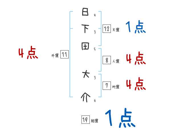 地運![]() | 日下田大介さんの地運は7画の4つ星!強い意志や信念を持ち独立心が強い。自立する。 個性を表す基礎的な運勢です。性格形成や対人関係、行動力など家庭環境に影響されます。主に誕生してから20歳くらいまでの若年期の運勢を表します。 |