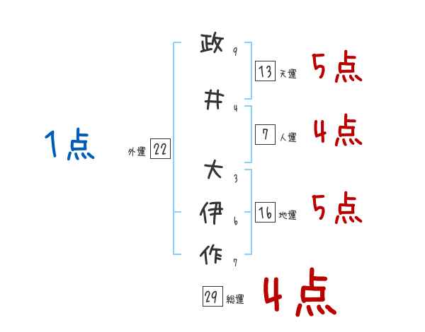 外運![]() | 政井大伊作さんの外運は22画の1つ星!努力することが苦手ないっぽう手先が器用。芸術性にも優れる。 生活面を象徴する運勢です。外部から受ける影響力を表し、結婚運、家庭運や職場、環境への順応性を表します。 |