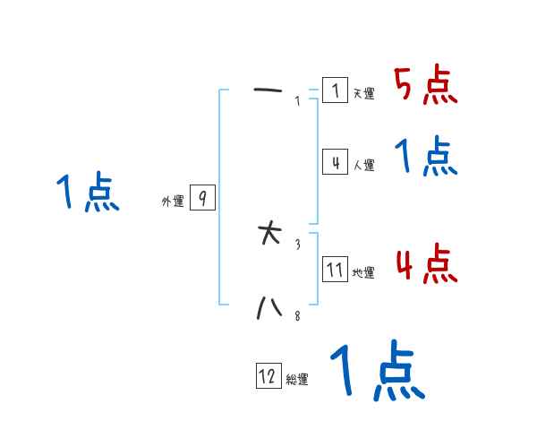 天運![]() | 一大八さんの天運は1画の5つ星!行動力、指導力があり出世し繁栄する。幸運に恵まれる。 家系が持つ宿命的な運勢を表します。祖先から受け継いだ苗字ですので自分の力が及びません。家柄を象徴します。 |