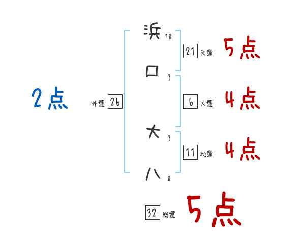 総運![]() | 浜口大八さんの総運は32画の5つ星!柔軟性があり成功する。チャンスが多く金運が良い。 あなたの人生を表す1番重要な運勢です。生涯を通じて影響する総合運となり、主に50歳以降の晩年期に影響を及ぼします。 |