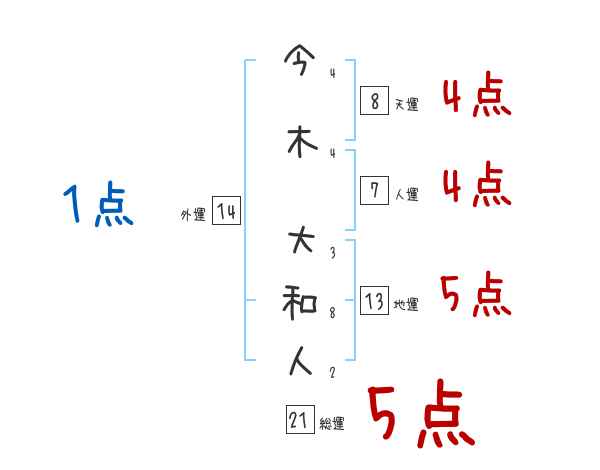 総運![]() | 今木大和人さんの総運は21画の5つ星!統率力がある。独立し成功する。名誉を手に入れる。 あなたの人生を表す1番重要な運勢です。生涯を通じて影響する総合運となり、主に50歳以降の晩年期に影響を及ぼします。 |