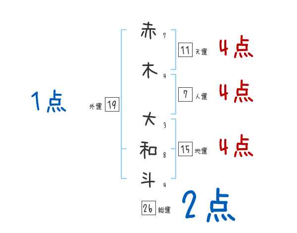 天運![]() | 赤木大和斗さんの天運は11画の4つ星!着実に富や地位を得る幸運な人生。 家系が持つ宿命的な運勢を表します。祖先から受け継いだ苗字ですので自分の力が及びません。家柄を象徴します。 |