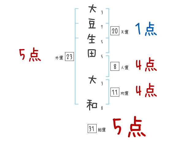 総運![]() | 大豆生田大和さんの総運は31画の5つ星!社交性があり判断力に優れる。順風満帆な人生で円満な生活。 あなたの人生を表す1番重要な運勢です。生涯を通じて影響する総合運となり、主に50歳以降の晩年期に影響を及ぼします。 |