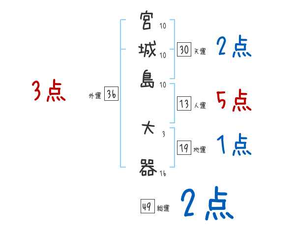 天運![]() | 宮城島大器さんの天運は30画の2つ星!浮き沈みの激しさに注意しましょう。 家系が持つ宿命的な運勢を表します。祖先から受け継いだ苗字ですので自分の力が及びません。家柄を象徴します。 |