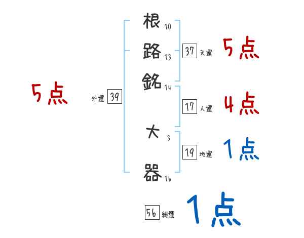 外運![]() | 根路銘大器さんの外運は39画の5つ星!社交性に優れ人望が厚い。人の上に立ち成功する。 生活面を象徴する運勢です。外部から受ける影響力を表し、結婚運、家庭運や職場、環境への順応性を表します。 |