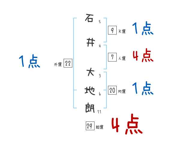 外運![]() | 石井大地朗さんの外運は22画の1つ星!努力することが苦手ないっぽう手先が器用。芸術性にも優れる。 生活面を象徴する運勢です。外部から受ける影響力を表し、結婚運、家庭運や職場、環境への順応性を表します。 |