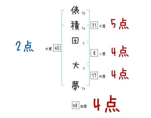 外運![]() | 俵積田大夢さんの外運は40画の2つ星!自信過剰で物事に固執するためトラブルに注意。 生活面を象徴する運勢です。外部から受ける影響力を表し、結婚運、家庭運や職場、環境への順応性を表します。 |