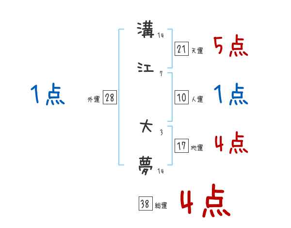 天運![]() | 溝江大夢さんの天運は21画の5つ星!統率力がある。独立し成功する。名誉を手に入れる。 家系が持つ宿命的な運勢を表します。祖先から受け継いだ苗字ですので自分の力が及びません。家柄を象徴します。 |