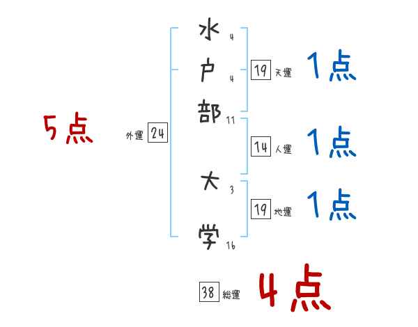 外運![]() | 水戸部大学さんの外運は24画の5つ星!家庭運が良く順調な人生。金運にも恵まれる。 生活面を象徴する運勢です。外部から受ける影響力を表し、結婚運、家庭運や職場、環境への順応性を表します。 |