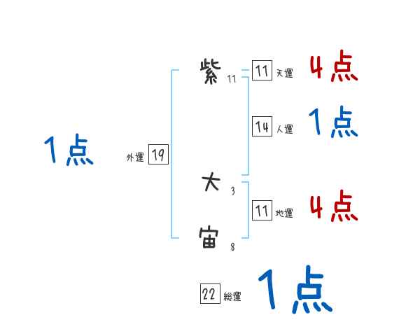 天運![]() | 紫大宙さんの天運は11画の4つ星!着実に富や地位を得る幸運な人生。 家系が持つ宿命的な運勢を表します。祖先から受け継いだ苗字ですので自分の力が及びません。家柄を象徴します。 |