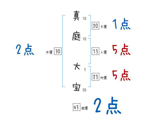 外運![]() | 真庭大宝さんの外運は30画の2つ星!浮き沈みの激しさに注意しましょう。 生活面を象徴する運勢です。外部から受ける影響力を表し、結婚運、家庭運や職場、環境への順応性を表します。 |