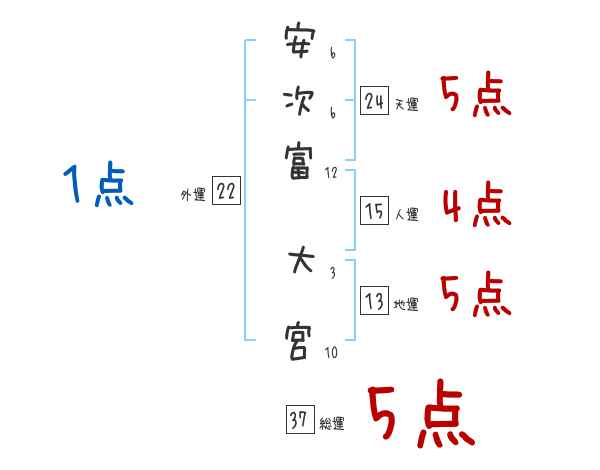 天運![]() | 安次富大宮さんの天運は24画の5つ星!家庭運が良く順調な人生。金運にも恵まれる。 家系が持つ宿命的な運勢を表します。祖先から受け継いだ苗字ですので自分の力が及びません。家柄を象徴します。 |