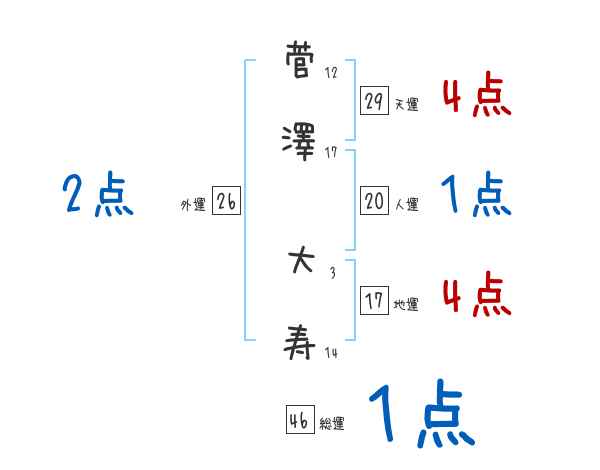 天運![]() | 菅澤大寿さんの天運は29画の4つ星!完全主義で才能がある。厳格な心の持ち主。 家系が持つ宿命的な運勢を表します。祖先から受け継いだ苗字ですので自分の力が及びません。家柄を象徴します。 |