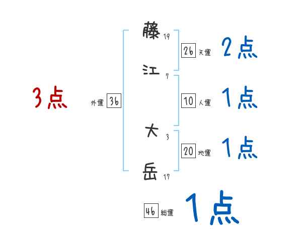 外運![]() | 藤江大岳さんの外運は36画の3つ星!先見性が豊かです。多少神経質で苦労することも。 生活面を象徴する運勢です。外部から受ける影響力を表し、結婚運、家庭運や職場、環境への順応性を表します。 |