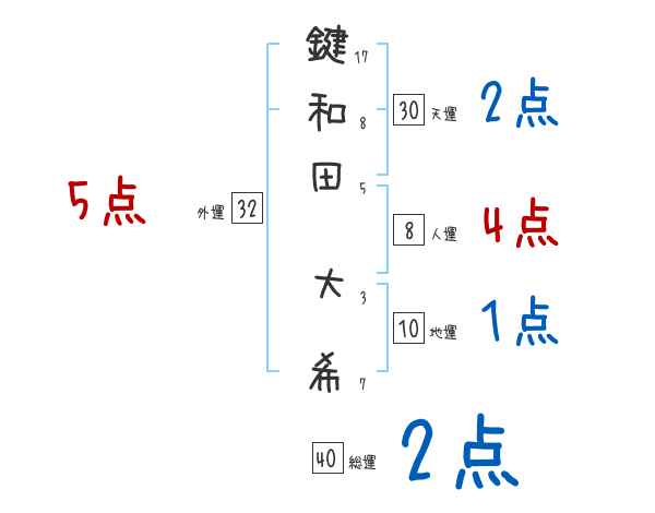 外運![]() | 鍵和田大希さんの外運は32画の5つ星!柔軟性があり成功する。チャンスが多く金運が良い。 生活面を象徴する運勢です。外部から受ける影響力を表し、結婚運、家庭運や職場、環境への順応性を表します。 |