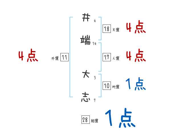 総運![]() | 井端大志さんの総運は28画の1つ星!家庭環境に注意。スポーツで活躍できる能力があるかも。 あなたの人生を表す1番重要な運勢です。生涯を通じて影響する総合運となり、主に50歳以降の晩年期に影響を及ぼします。 |