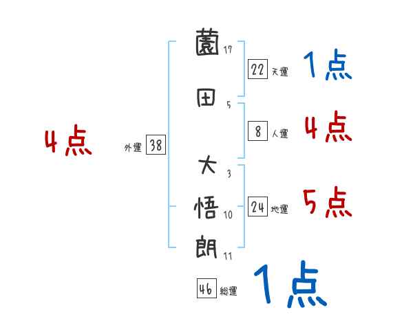 総運![]() | 薗田大悟朗さんの総運は46画の1つ星!迷走することが多く苦労するかも。目先のことにとらわれないように。 あなたの人生を表す1番重要な運勢です。生涯を通じて影響する総合運となり、主に50歳以降の晩年期に影響を及ぼします。 |