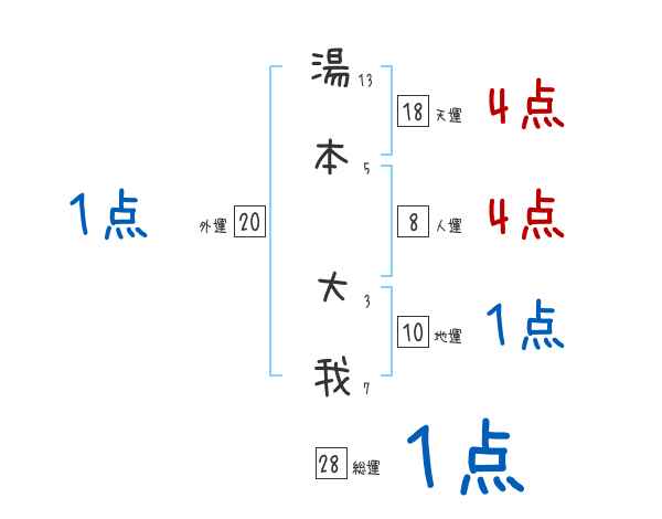天運![]() | 湯本大我さんの天運は18画の4つ星!情熱的で剛気。忍耐力があり信頼される。 家系が持つ宿命的な運勢を表します。祖先から受け継いだ苗字ですので自分の力が及びません。家柄を象徴します。 |