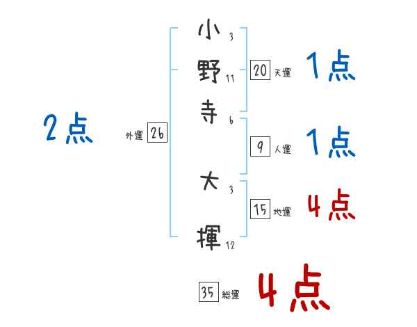 外運![]() | 小野寺大揮さんの外運は26画の2つ星!波瀾万丈かも。信頼できる人を大事にしましょう。 生活面を象徴する運勢です。外部から受ける影響力を表し、結婚運、家庭運や職場、環境への順応性を表します。 |