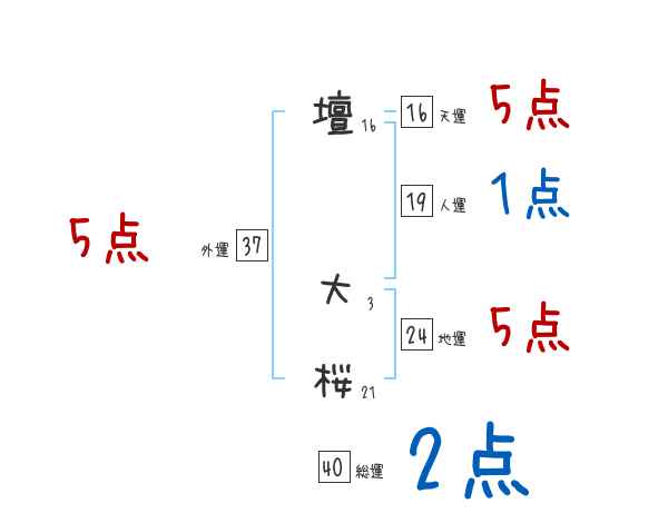 天運![]() | 壇大桜さんの天運は16画の5つ星!人望が厚く大きく発展する。逆転成功が見える。 家系が持つ宿命的な運勢を表します。祖先から受け継いだ苗字ですので自分の力が及びません。家柄を象徴します。 |