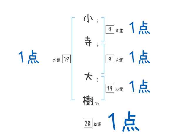外運![]() | 小寺大樹さんの外運は19画の1つ星!優れた才能を持ちますが、協調性が足りないことも。周りの人と協力する事を意識しましょう。 生活面を象徴する運勢です。外部から受ける影響力を表し、結婚運、家庭運や職場、環境への順応性を表します。 |