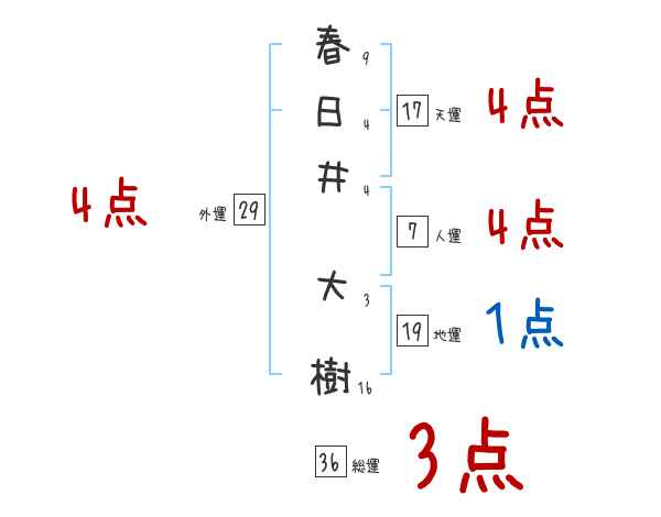 天運![]() | 春日井大樹さんの天運は17画の4つ星!積極的な行動力。地位を気づき財産を手に入れる。純粋な心と直感力。 家系が持つ宿命的な運勢を表します。祖先から受け継いだ苗字ですので自分の力が及びません。家柄を象徴します。 |