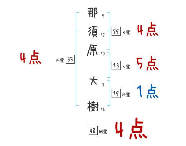 外運![]() | 那須原大樹さんの外運は35画の4つ星!温厚な性格で感受性が高い。穏和な性格で人望が厚い。 生活面を象徴する運勢です。外部から受ける影響力を表し、結婚運、家庭運や職場、環境への順応性を表します。 |