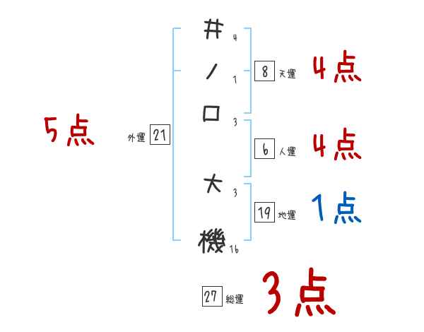 外運![]() | 井ノ口大機さんの外運は21画の5つ星!統率力がある。独立し成功する。名誉を手に入れる。 生活面を象徴する運勢です。外部から受ける影響力を表し、結婚運、家庭運や職場、環境への順応性を表します。 |