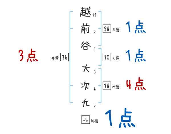 天運![]() | 越前谷大次九さんの天運は28画の1つ星!家庭環境に注意。スポーツで活躍できる能力があるかも。 家系が持つ宿命的な運勢を表します。祖先から受け継いだ苗字ですので自分の力が及びません。家柄を象徴します。 |