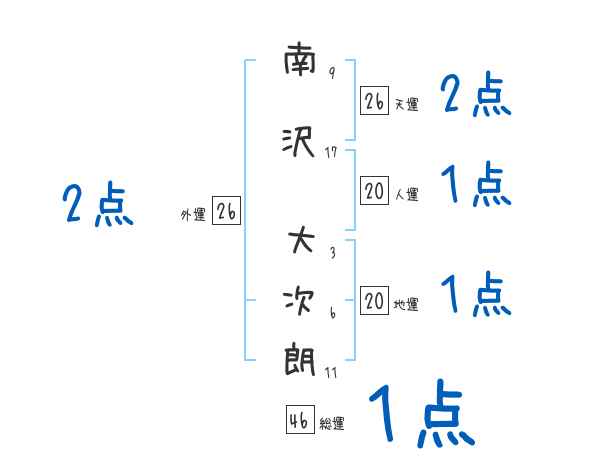 外運![]() | 南沢大次朗さんの外運は26画の2つ星!波瀾万丈かも。信頼できる人を大事にしましょう。 生活面を象徴する運勢です。外部から受ける影響力を表し、結婚運、家庭運や職場、環境への順応性を表します。 |