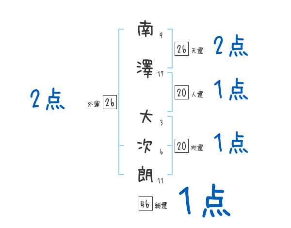外運![]() | 南澤大次朗さんの外運は26画の2つ星!波瀾万丈かも。信頼できる人を大事にしましょう。 生活面を象徴する運勢です。外部から受ける影響力を表し、結婚運、家庭運や職場、環境への順応性を表します。 |