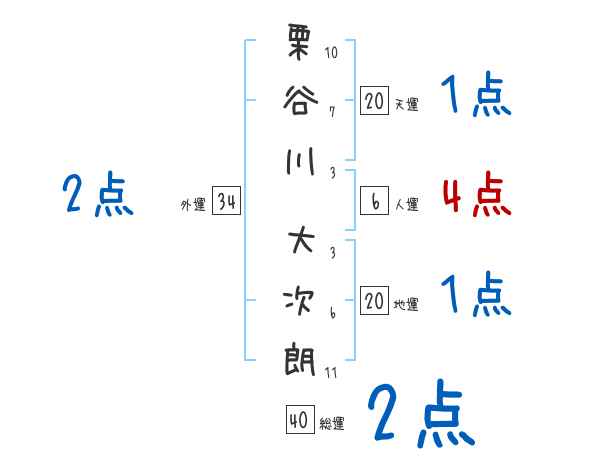 外運![]() | 栗谷川大次朗さんの外運は34画の2つ星!独創性に優れるが、自尊心が強く災難に注意しましょう。 生活面を象徴する運勢です。外部から受ける影響力を表し、結婚運、家庭運や職場、環境への順応性を表します。 |