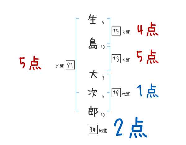総運![]() | 生島大次郎さんの総運は34画の2つ星!独創性に優れるが、自尊心が強く災難に注意しましょう。 あなたの人生を表す1番重要な運勢です。生涯を通じて影響する総合運となり、主に50歳以降の晩年期に影響を及ぼします。 |