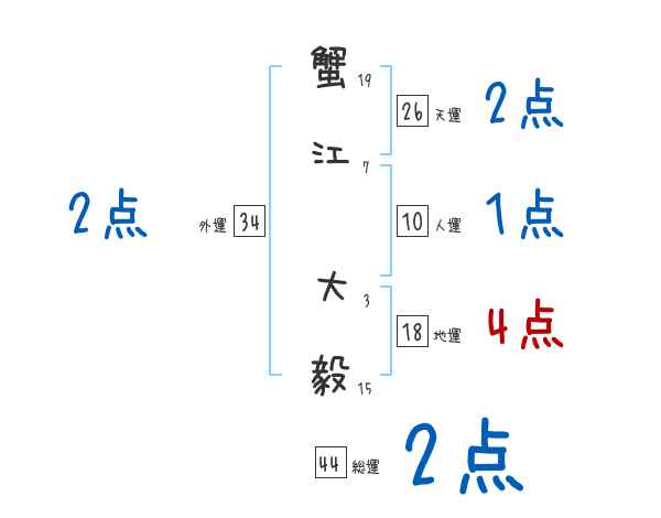 天運![]() | 蟹江大毅さんの天運は26画の2つ星!波瀾万丈かも。信頼できる人を大事にしましょう。 家系が持つ宿命的な運勢を表します。祖先から受け継いだ苗字ですので自分の力が及びません。家柄を象徴します。 |