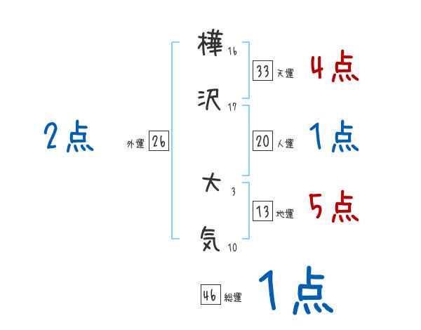 総運![]() | 樺沢大気さんの総運は46画の1つ星!迷走することが多く苦労するかも。目先のことにとらわれないように。 あなたの人生を表す1番重要な運勢です。生涯を通じて影響する総合運となり、主に50歳以降の晩年期に影響を及ぼします。 |
